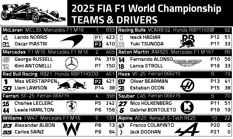 Generate a 1-bit BMP image showing all F1 teams with their drivers, photos, and championship points.